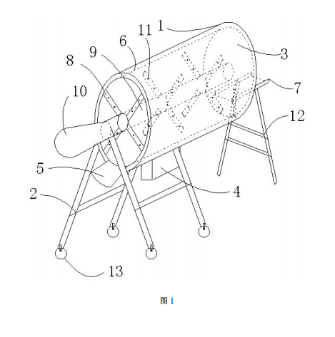 滚筒筛内设置有搅拌架,搅拌架被支撑架支撑,搅拌架通过搅拌轴 与土壤箱外的电机相连接。 搅拌架上设置有多个碎土的带状凸起。 入料口处,土壤箱上设置有一可用于送料的梯子,梯子与土壤箱活 动连接。 作为优选,所述支撑架上设置有可带动土壤箱滑动的滑轮。 与现有技术相比,本发明的优点在于 :