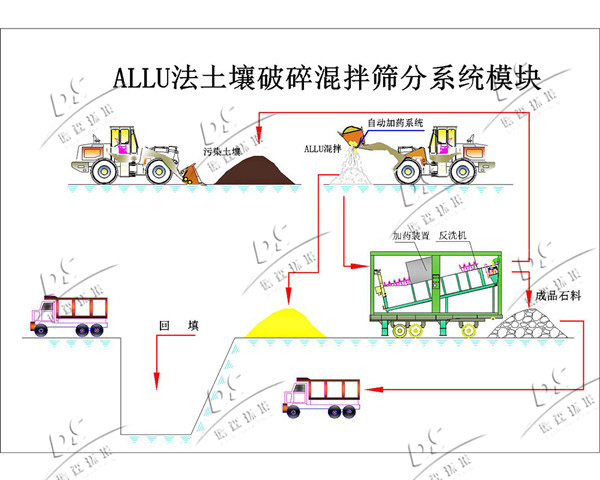 土壤破碎混拌系统主要是采用液压破碎铲斗、高效多级土壤筛、双齿辊式土壤破碎机等专业设备对污染土壤进行破碎、筛分、混合、稳定、搅拌等综合作业,在固化剂、药剂作用下实现对污染土壤的稳固、无害化及再利用处理。