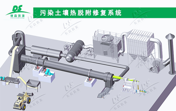 整套热脱附修复系统包括:供料系统、热源系统、热脱附旋转窑系统、二燃室系统、尾气收集除尘系统、余热循环利用系统等。实际工艺将根据污染土壤案例具体情况优化调整,以实现最优化工艺设计及设备配套。其核心设备包括:旋转式热脱附窑,二燃室,热交换器等。